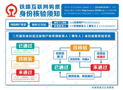 據(jù)介紹,實(shí)施身份信息核驗(yàn)后,在12306網(wǎng)站上使用二代居民身份證的注冊(cè)用戶和常用聯(lián)系人身份信息將有“已通過”、“待核驗(yàn)”、“未通過”三種核驗(yàn)狀態(tài),使用護(hù)照、港澳居民來往內(nèi)地通行證、臺(tái)灣居民來往大陸通行證的注冊(cè)用戶和常用聯(lián)系人身份信息將有“已通過”、“請(qǐng)報(bào)驗(yàn)”、“預(yù)通過”、“未通過”四種核驗(yàn)狀態(tài)。